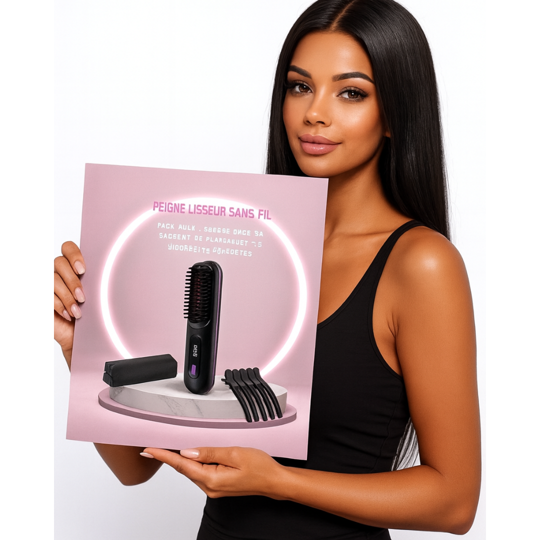 Avec notre Brosse lissante vous trouverez les accessoires suivant inclus dans l'emballage : Trousse de rangement, pratique pour emporter votre brosse en voyage ou pour la stocker en toute sécurité. Cable de chargement USB, une paire de peigne ,une paire d'attache épingle. Un guide détaillé du mode d'emploi.